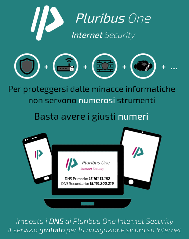 Ricordiamo a tutti gli utenti che Pluribus One ha sviluppato Pluribus One Internet Security, un servizio gratuito per la navigazione sicura su Internet, che consente di evitare domini contenenti Phishing, Malware, e consente inoltre di evitare la pubblicità indesiderata, anche quella che appare sui video in riproduzione.